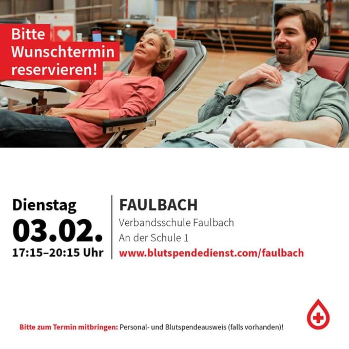 Am Dienstag, den 03.02.2026 findet in der Zeit von 17:15 bis ca. 20:15 Uhr in der Verbandsschule Faulbach ein Blutspendetermin statt.