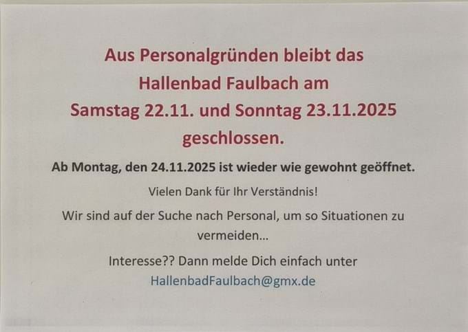 Wegen Personalmangel bleibt das Hallenbad in Faulbach am Samstag, 22.11. und Sonntag, 23.11.2025 geschlossen!